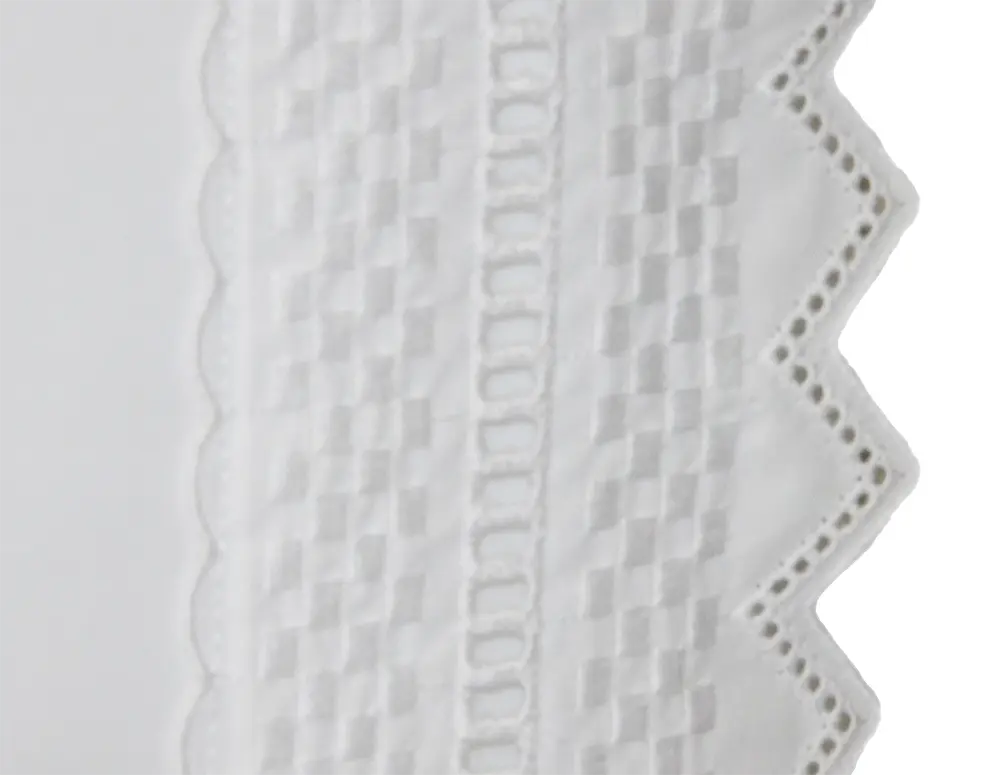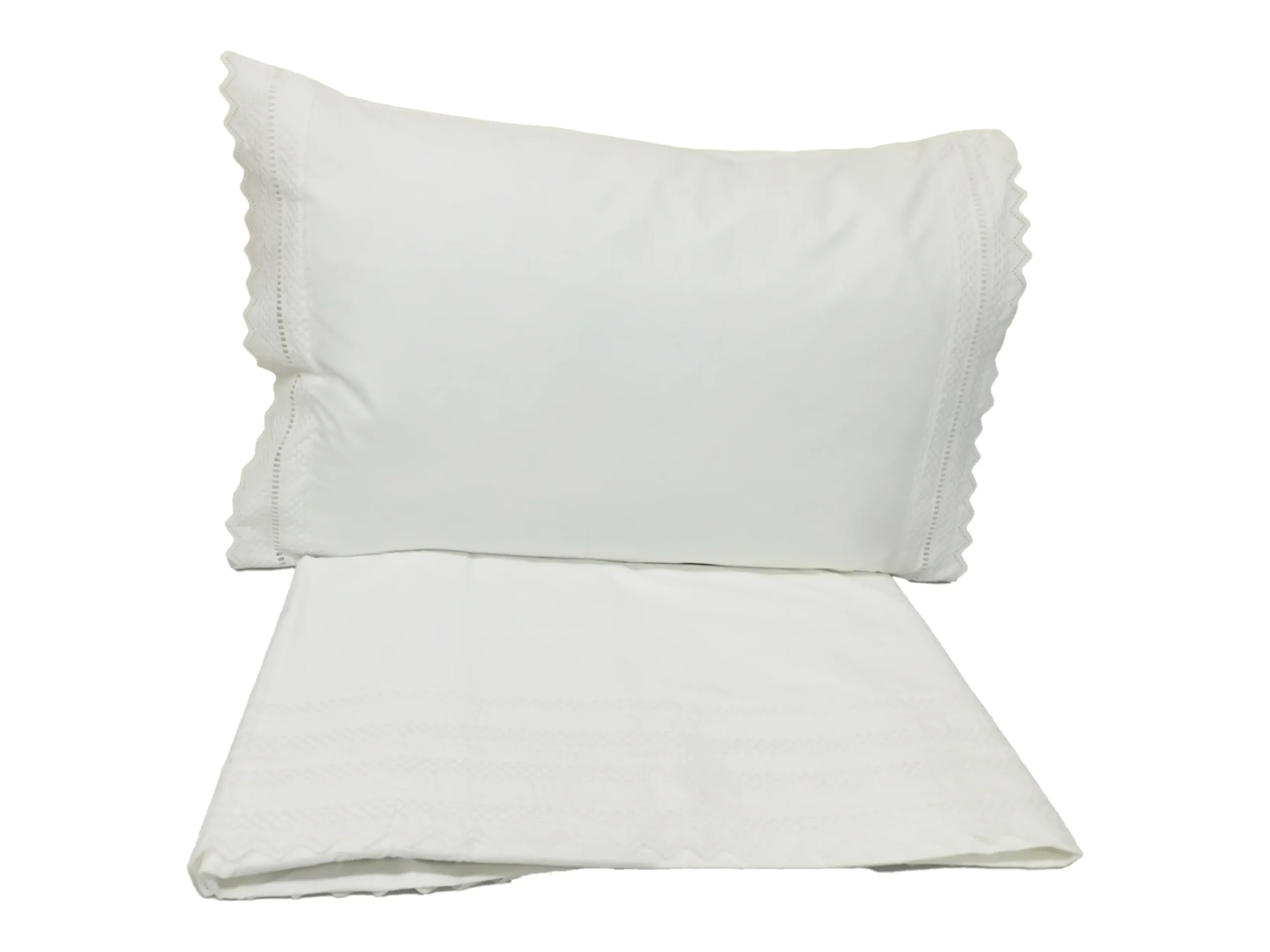 com lençol de cima com Bordado Inglês e lençol de baixo liso na cor branco.