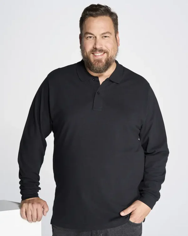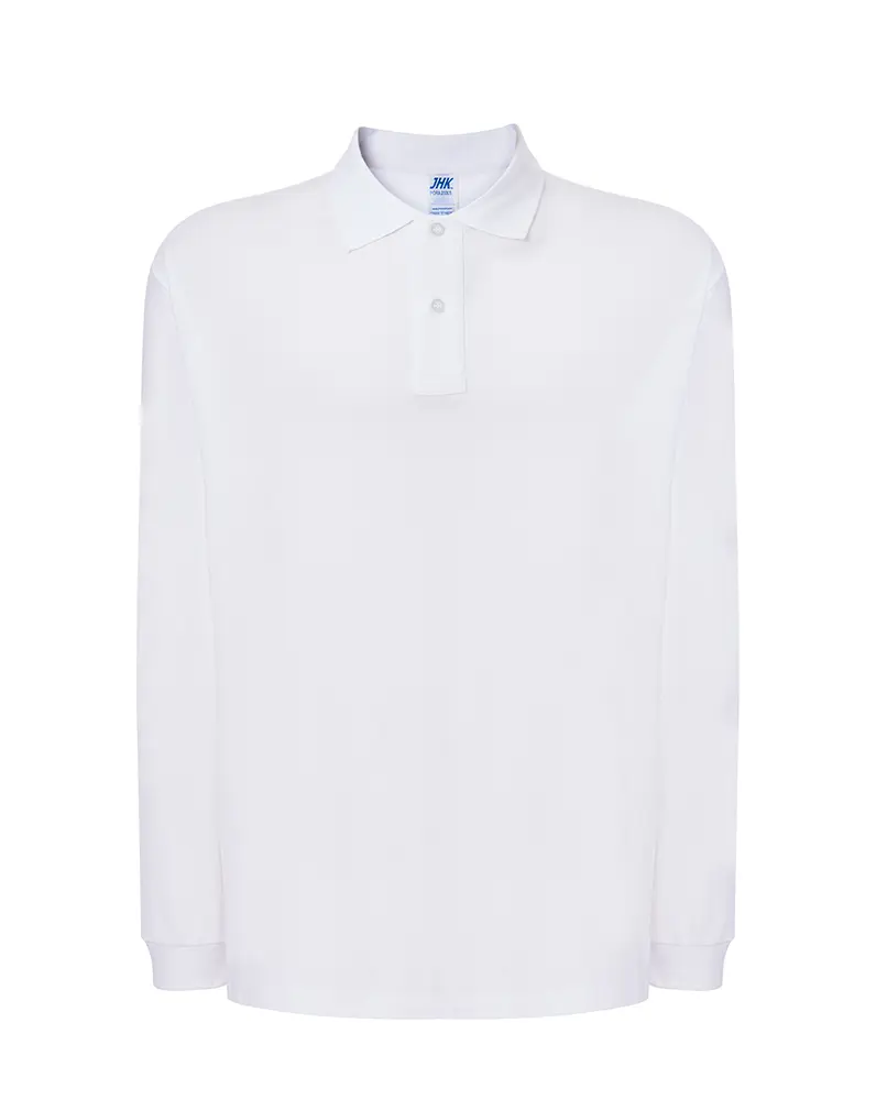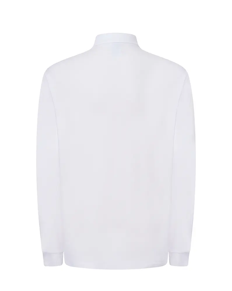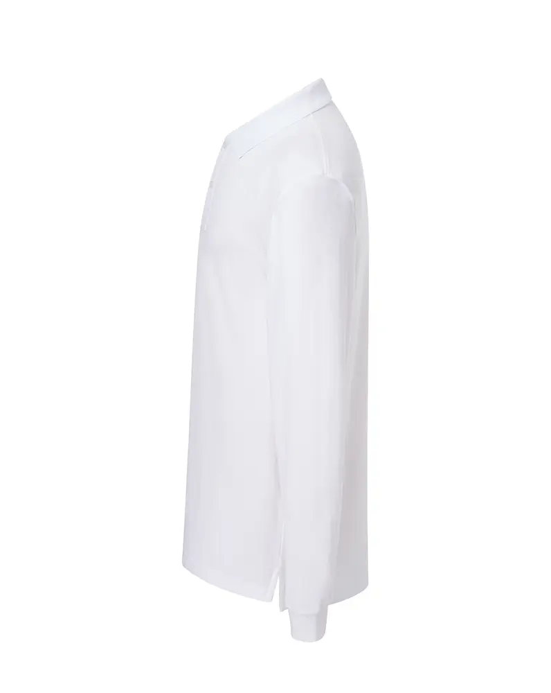 Polo piqué de homem com mangas compridas, com carcela com 2 botões á cor, manga canelada e aberturas laterais.