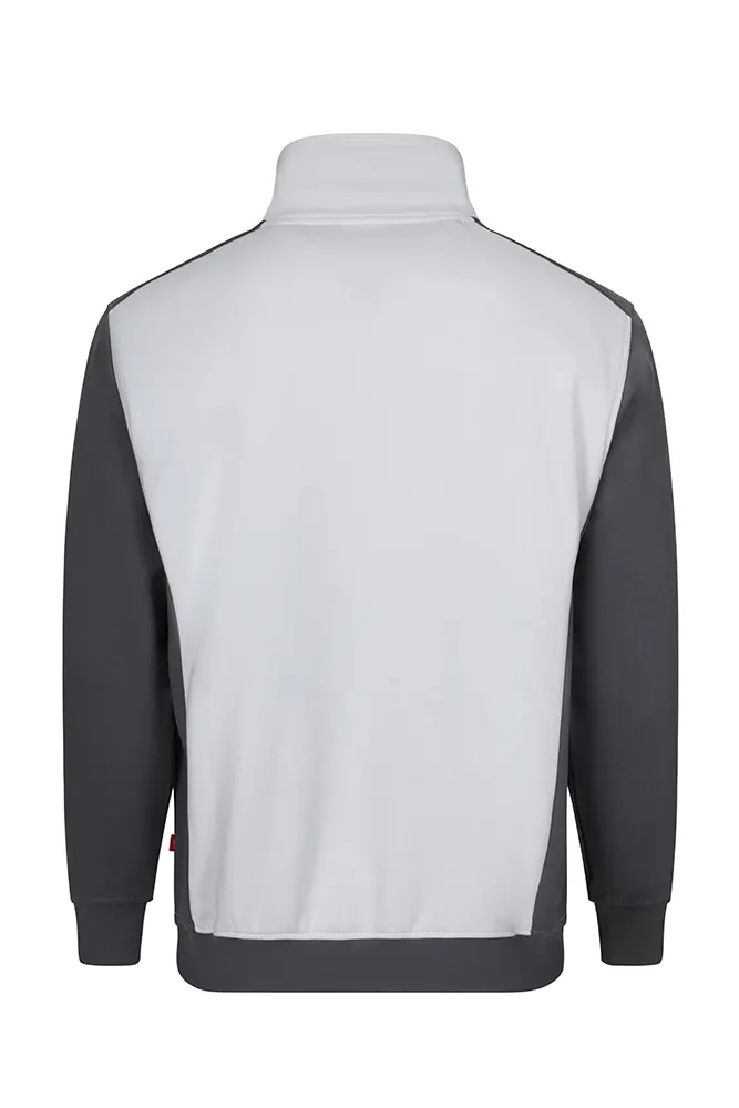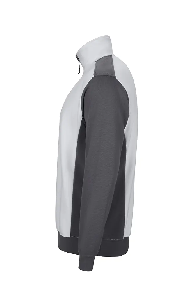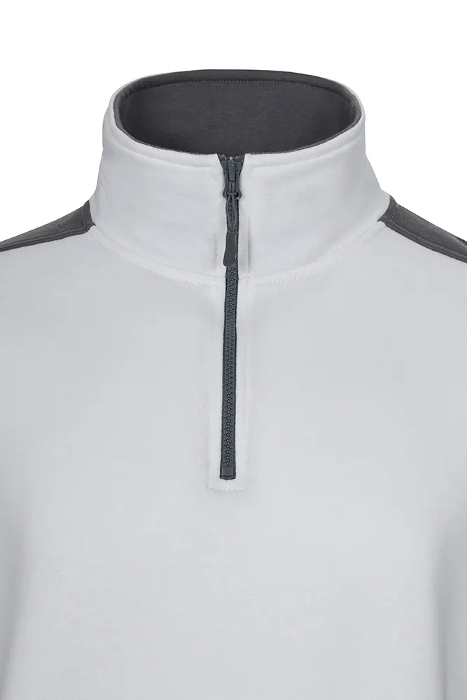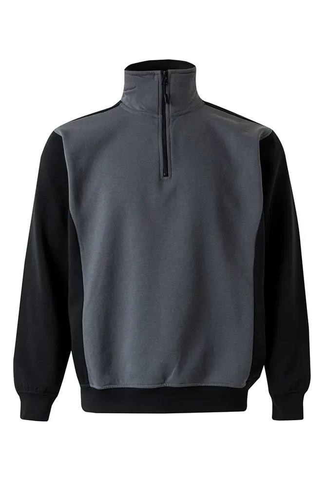 Sweatshirt de gola alta com meio fecho, contraste de cor de lado, nas mangas, ombros, interior da gola e na parte inferior da peça.
